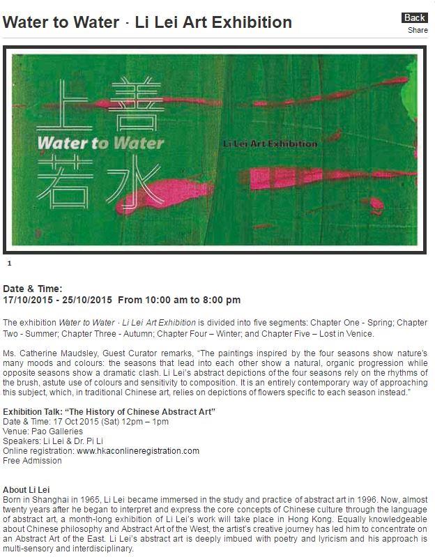 Selected Curatorial Projects Water to Water – Li Lei Art Exhibition 上善若水 | 李磊藝術展 Guest Curator October 17, 2015 – October 25, 2015Hong Kong Arts CentreHong Kong
